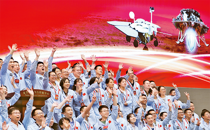 近年來,越來越多的青年人才在科技創新第一線“冒尖”,逐步成為科研主力軍。圖為2021年5月15日,航天科研人員在北京航天飛行控制中心指揮大廳慶祝我國首次火星探測任務著陸火星成功。 新華社記者 金立旺/攝