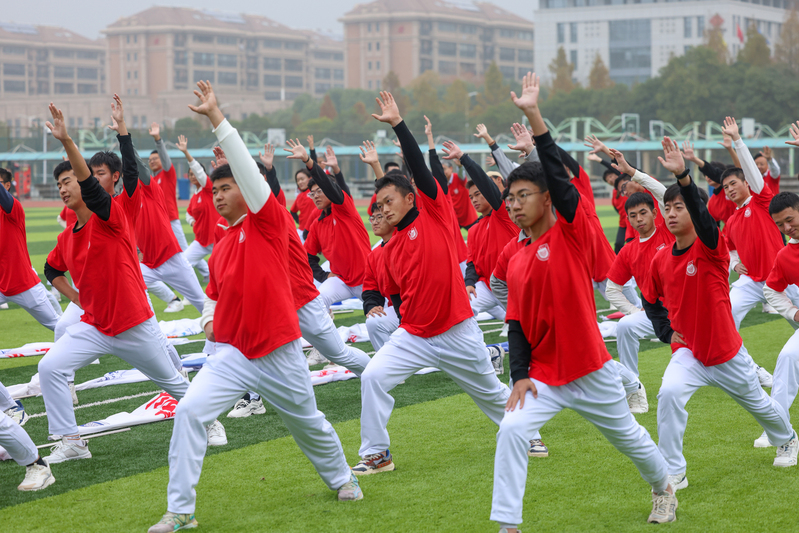 師生進行跑步前熱身