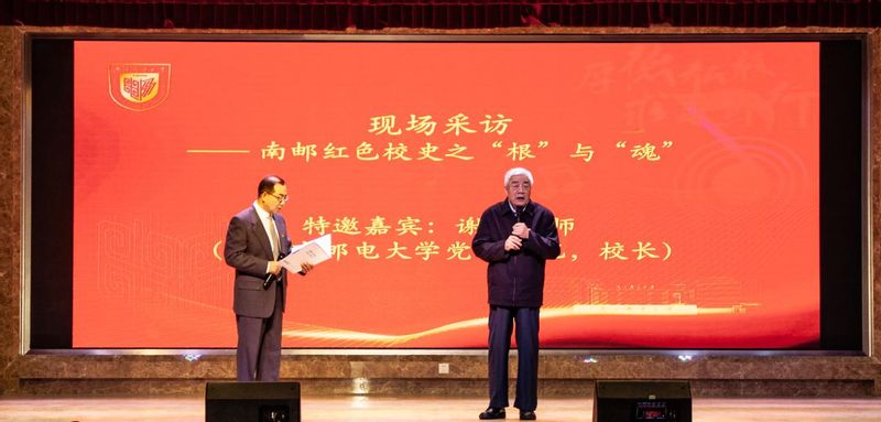 主講人、江蘇省教學名師楊庚教授首先請出南郵原黨委書記兼校長謝玲,為在場的師生講述“南郵校史與紅色血脈”。謝玲老書記從“南郵的辦學起源”“最初辦學地點的查找確認”“學校遷址南京后的發展歷程”三個方面展開敘述。“南郵人始終不會忘記戰郵干訓班這段不平凡的辦學歷史,這是我們南郵為黨育人、為國育才的根;南郵人也始終不會忘記傳承戰郵精神,這是我們南郵人的初心之魂。”謝玲老書記動情的話語,深深地震撼著師生的心靈,也引發了大家更深的思考。