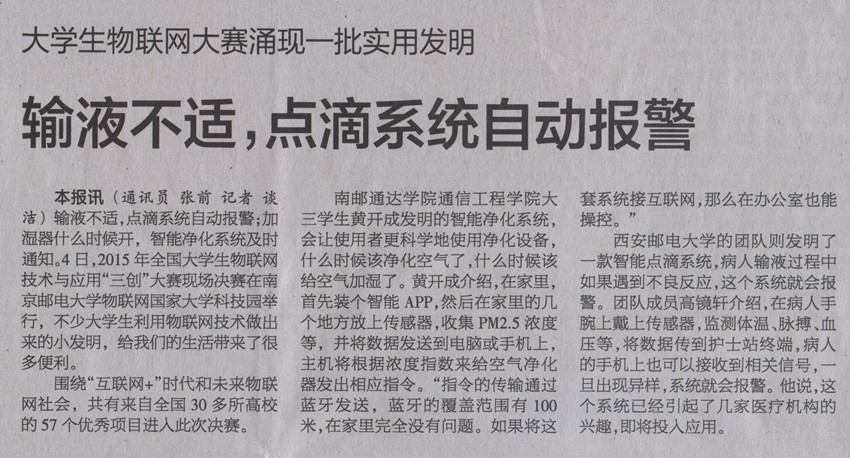 【南京日報】輸液不適,點滴系統自動報警