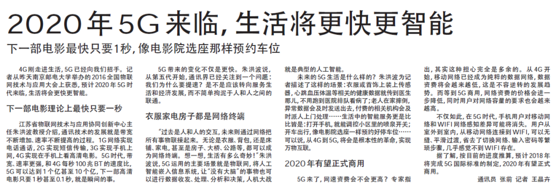 【南京晨報】2020年5G來臨,生活將更快更智能