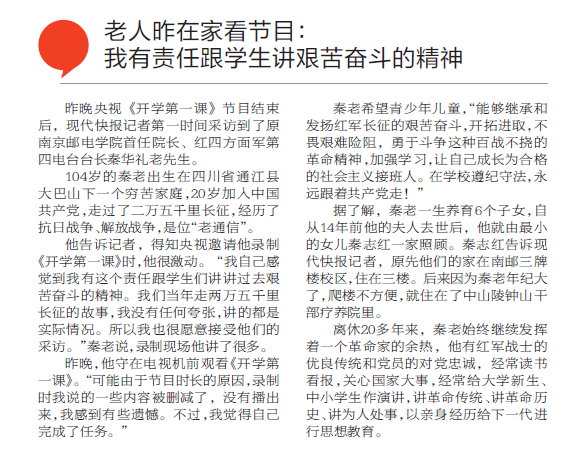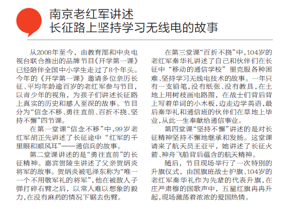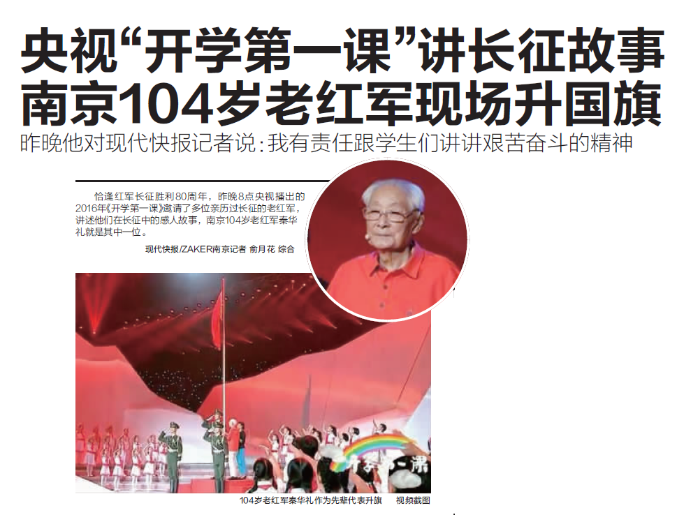 【現代快報】央視“開學第一課”講長征故事 南京104歲老紅軍現場升國旗