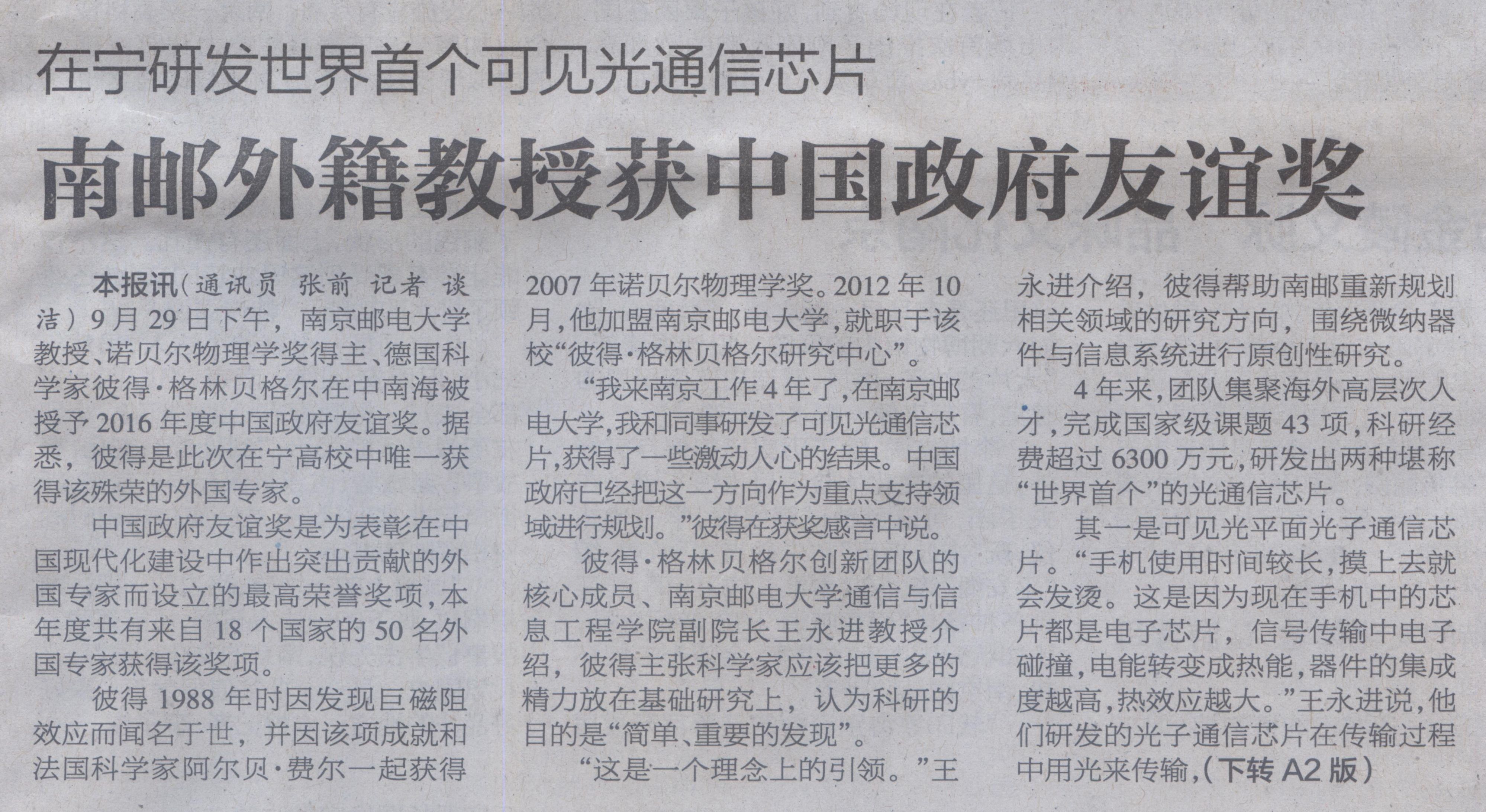 【南京日?qǐng)?bào)】南郵外籍教授獲中國(guó)政府友誼獎(jiǎng)(頭版)