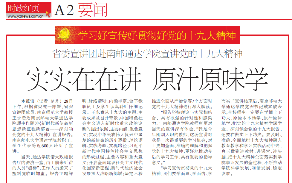 【揚州日報】省委宣講團赴南郵通達學院宣講黨的十九大精神