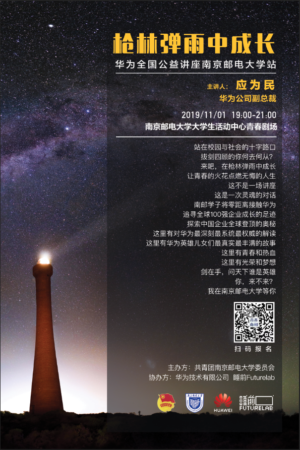 2019年11月1日19:00,“槍林彈雨中成長華為全國巡回公益講座南京郵電大學站”講座將在仙林校區青春劇場舉辦。屆時,活動將進行同步直播。 歡迎廣大師生前往劇場或掃碼收看!
