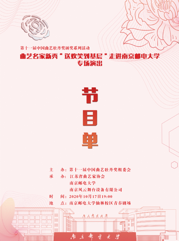 金秋金陵迎盛會,牡丹傲放迎賓朋。為了營造良好的高校文化氛圍,提高大學生人文藝術素養,曲藝名家新秀“送歡笑進基層”走進南京郵電大學專場演出活動將于2020年10月17日(周六)19:00在我校仙林校區大學生活動中心青春劇場舉行,歡迎廣大師生前來觀看。