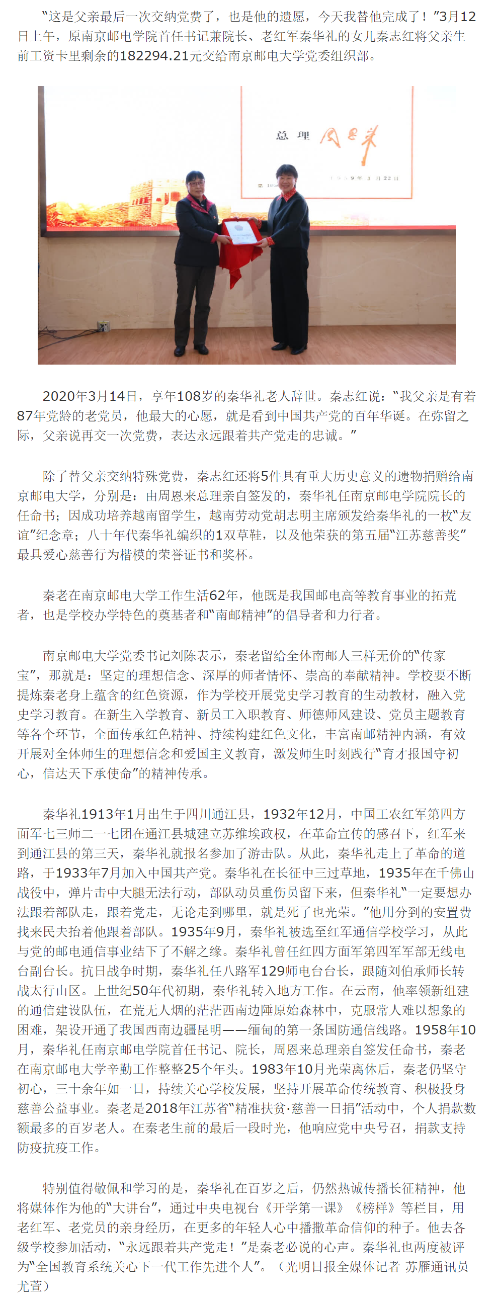 | 【光明日報客戶端】“我父親最大的心愿,就是看到黨的百年華誕” 辭世老紅軍秦華禮子女遵囑交納十八萬元特殊黨費 |