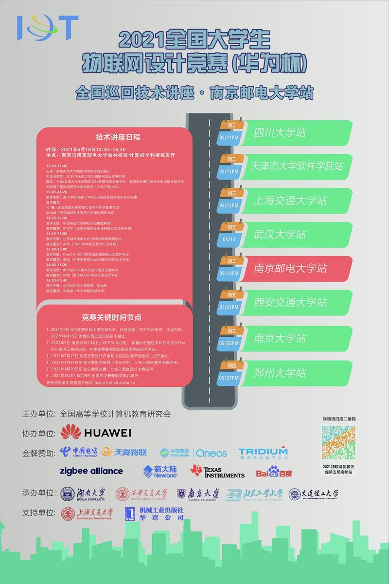 “全國大學生物聯網設計競賽”是由教育部高等學校計算機類專業教學指導委員會和物聯網工程專業建設研究專家組共同發起,以促進國內物聯網相關專業建設和人才培養為目標,以物聯網技術為核心,激發物聯網相關專業學生的創造、創新、創業活力,推動高校創新創業教育而舉辦的面向大學生的學科競賽。在成功舉辦2014-2020年連續七屆“全國大學生物聯網設計競賽”的基礎上,競賽組委會決定繼續主辦“2021 年全國大學生物聯網設計競賽”(以下簡稱“競賽”)。 5月18日,2021年全國大學生物聯網設計競賽(華為杯)全國巡回技術講座·南京郵電大學站全面開啟!我們邀您共探物聯網發展趨勢,體驗最前沿技術,了解最新市場需求,動手體驗物聯網平臺技術能力! 技術講座日程: 時間:2021年5月18日(周二)13:30-16:40 地點:南京郵電大學仙林校區計算機學科樓報告廳 13:30-13:40 組委會致辭: 2021年全國大學生物聯網設計競賽介紹 嘉賓:王東(全國大學生物聯網設計競賽組委會秘書長、教育部計算機類專業教學指導委員會物聯網工程教學研究專家組成員,上海交通大學) 13:40-14:20 演講主題:基于中國電信CTWing平臺的在線開發和開發實操 演講嘉賓: 付薔(天翼物聯科技有限公司平臺開發高級專家) 廖劍峰(天翼物聯科技有限公司硬件高級專家) 14:20-14:40 演講主題:中國電信天翼物聯開發賽題解讀 演講嘉賓:申志平(天翼科技創業投資有限公司項目經理) 14:40-15:00 演講主題:讓作品快速商業化通用物聯網框架技術 演講嘉賓:徐風(Tridium中國區教育行業經理) 15:00-16:00 演講主題: OneOS-助力更輕松迅捷的嵌入式軟件開發 演講嘉賓:唐堯(中移物聯網OneOS研發團隊技術專家) 16:00-16:20 演講主題:新大陸AloT技術平臺介紹及應用案例 演講嘉賓:林亮(新大陸AIoT平臺開發技術專家) 16:20-16:40 演講主題:華為技術助力新基建、新物聯 演講嘉賓:李晶晶(華為戰略規劃經理)