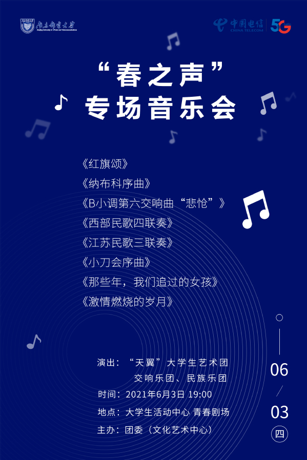 為進(jìn)一步濃郁校園文化藝術(shù)氛圍,提升在校學(xué)生的審美情趣和人文素養(yǎng),堅(jiān)持以美育人、以美化人、以美培元,團(tuán)委(文化藝術(shù)中心)將于6月3日(周四)19:00在仙林校區(qū)青春劇場(chǎng)舉辦 “春之聲”專場(chǎng)音樂(lè)會(huì)。本場(chǎng)音樂(lè)會(huì)將由我?!疤煲怼贝髮W(xué)生藝術(shù)團(tuán)交響樂(lè)團(tuán)、民族樂(lè)團(tuán)演出,歡迎廣大師生前來(lái)欣賞。