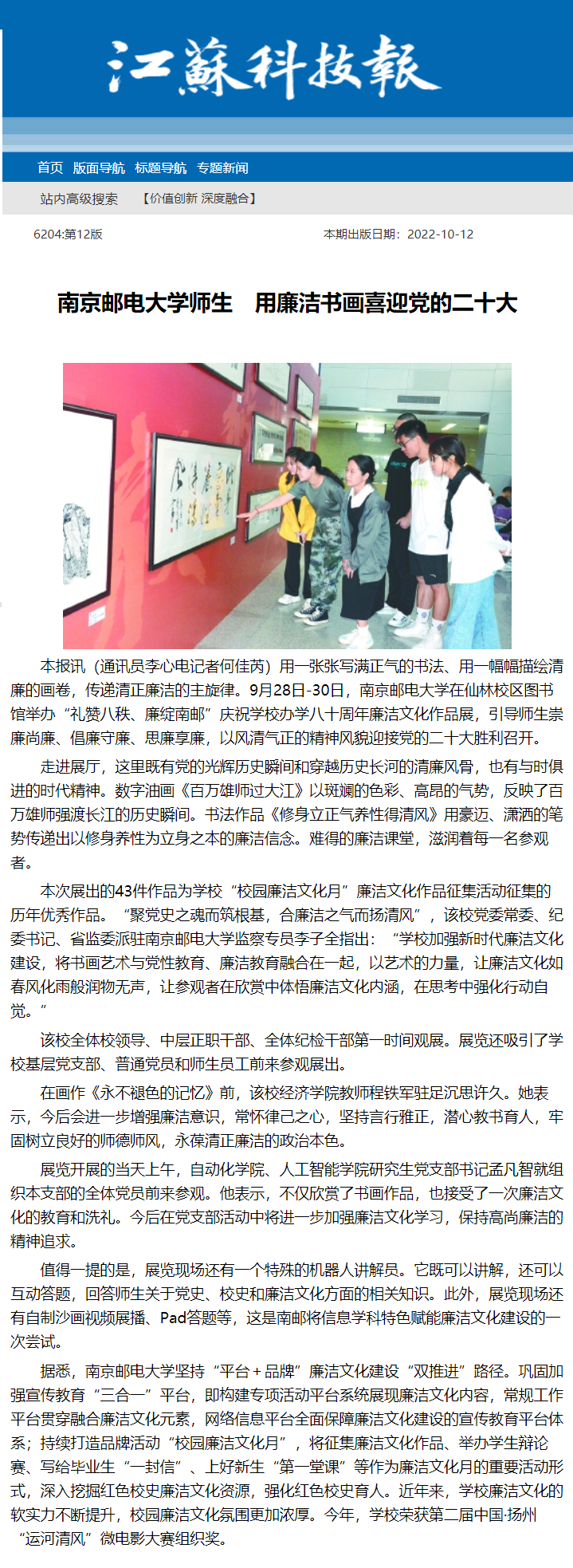 | 【江蘇科技報】南京郵電大學師生 用廉潔書畫喜迎黨的二十大 |