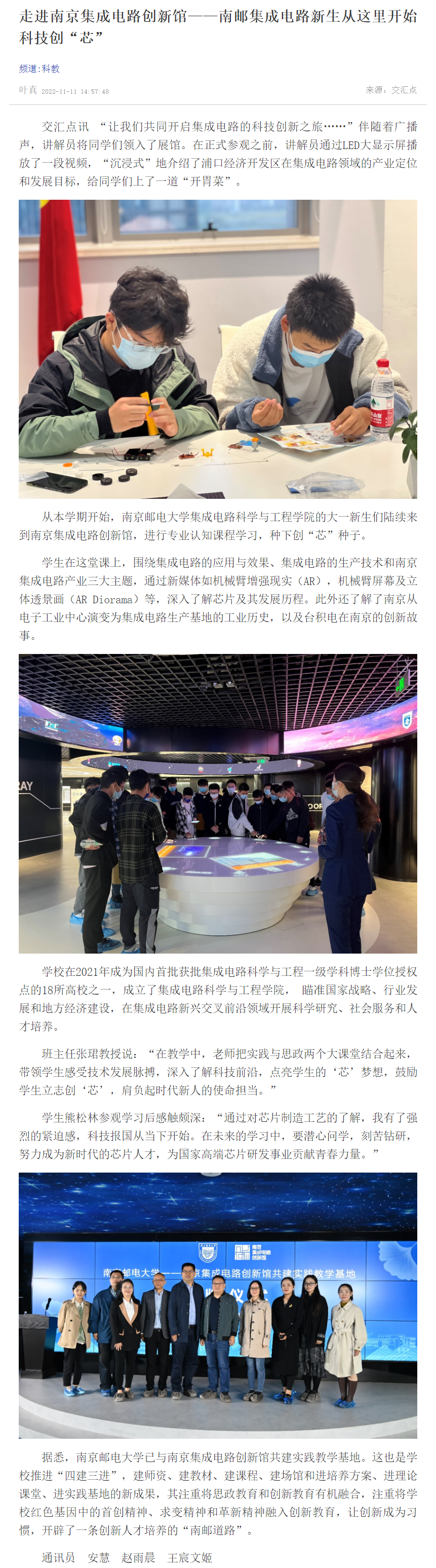 | 【新華日報客戶端】走進南京集成電路創(chuàng)新館——南郵集成電路新生從這里開始科技創(chuàng)“芯” |