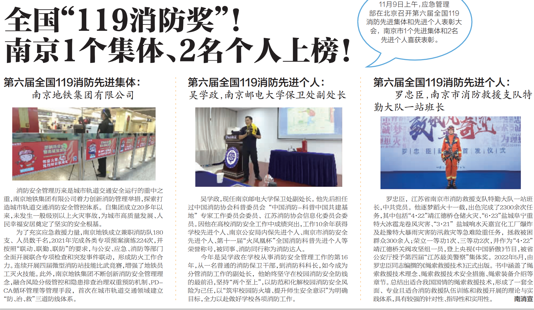 | 【金陵晚報】全國“119消防獎”! 南京1個集體、2名個人上榜! |
