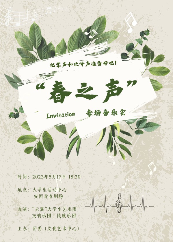 為進一步濃郁校園文化藝術氛圍,提升在校學生的審美情趣和人文素養,團委(文化藝術中心)將于5月17日(周三)18:30在仙林校區青春劇場舉辦 “春之聲”專場音樂會。本場音樂會將由我?!疤煲怼贝髮W生藝術團交響樂團、民族樂團演出。