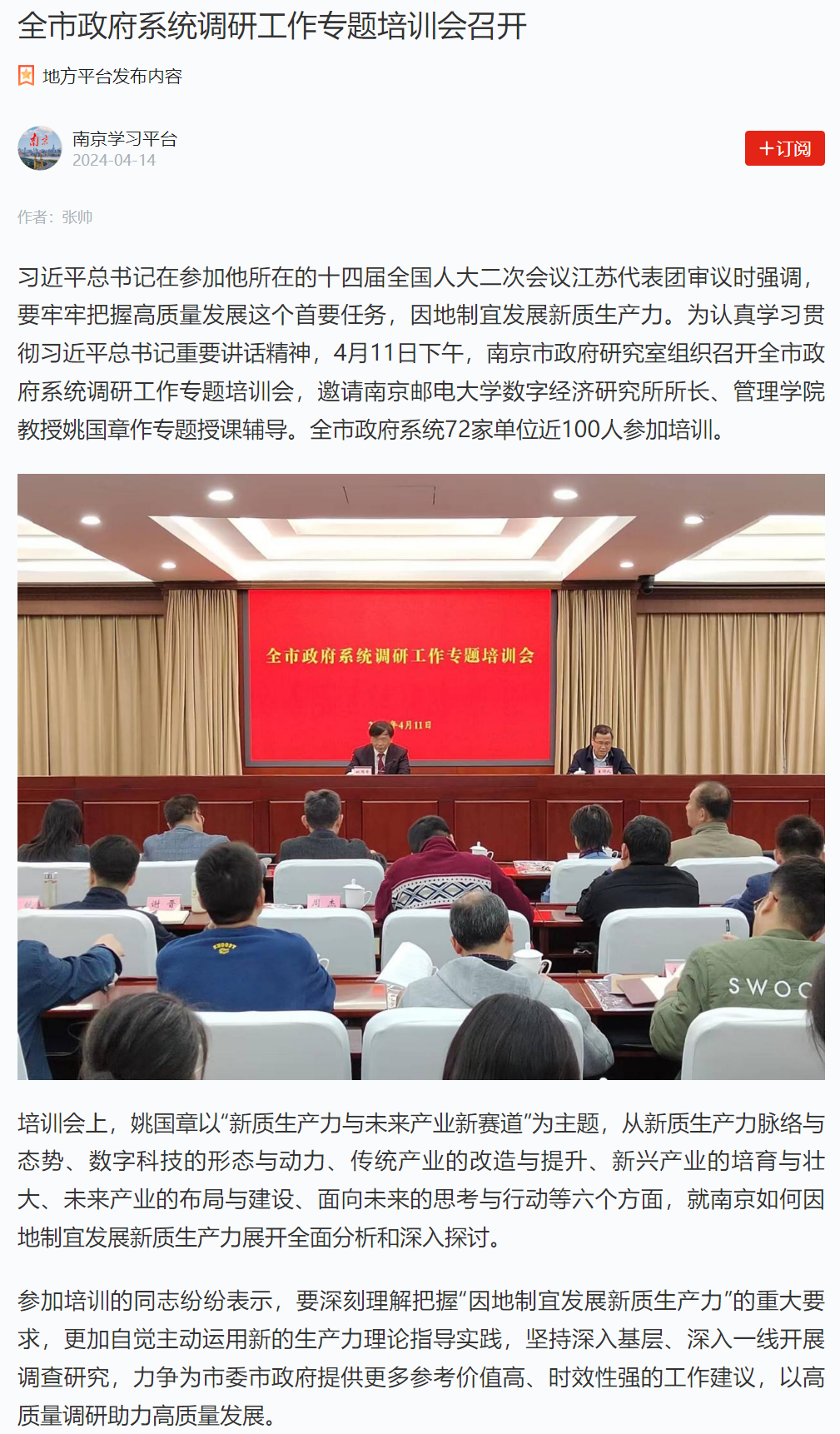 | 【學習強國】南郵管理學院教授姚國章作全市政府系統調研工作專題授課輔導 |