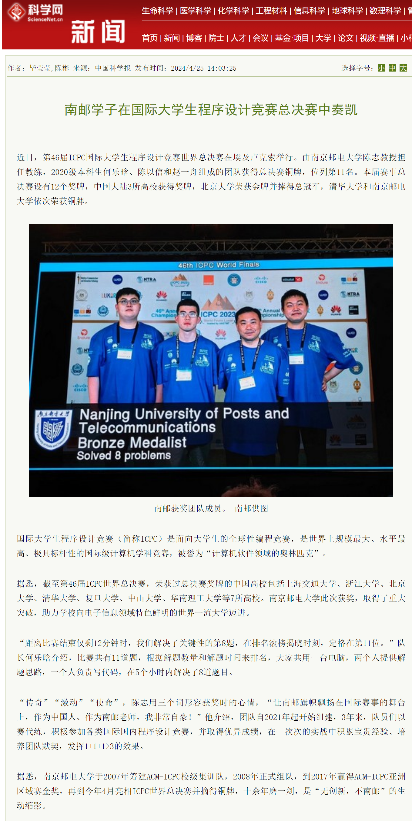 | 【科學網】南郵學子在國際大學生程序設計競賽總決賽中奏凱 |