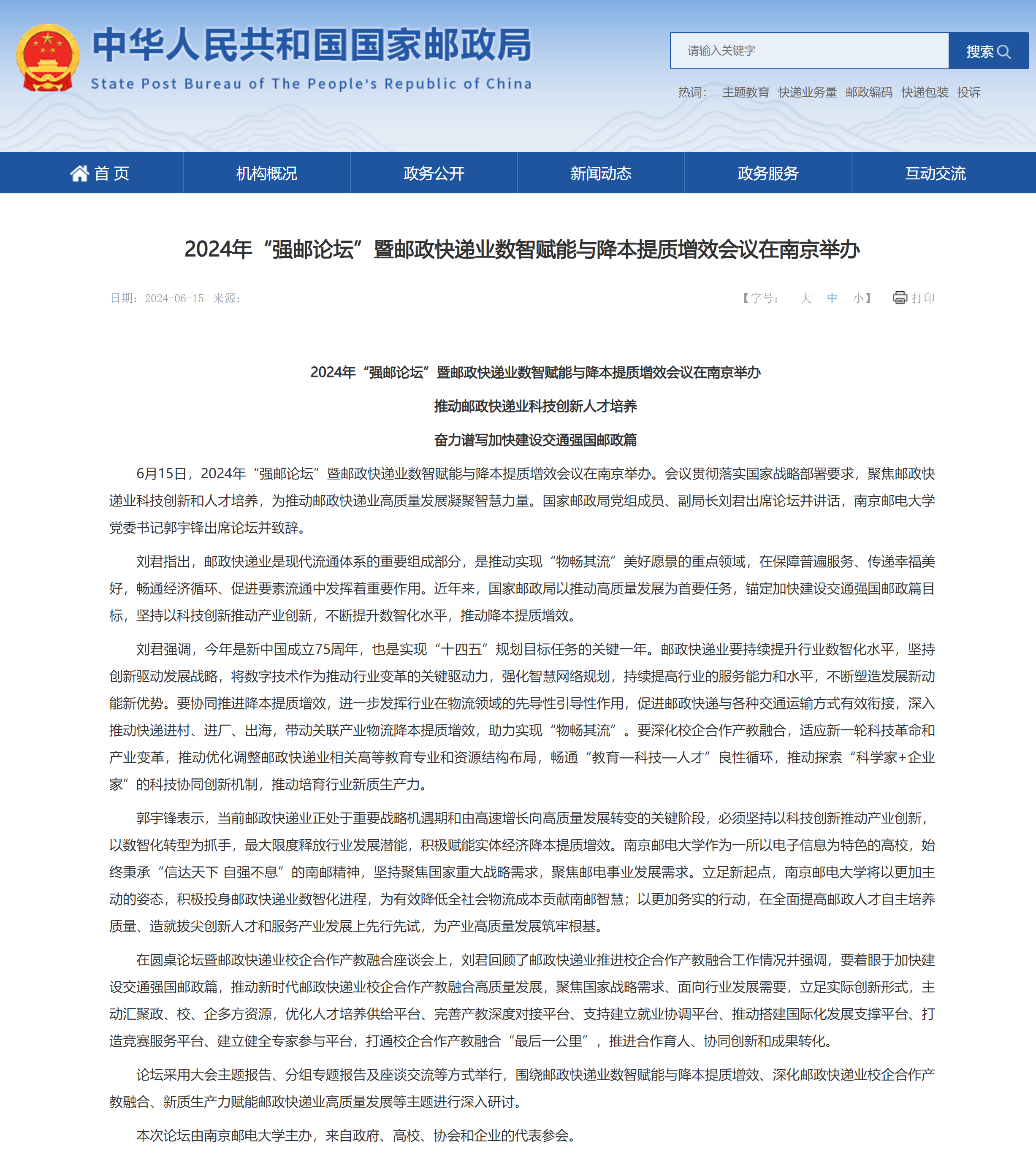 | 【國家郵政局官網】2024年“強郵論壇”暨郵政快遞業數智賦能與降本提質增效會議在南京舉辦 |