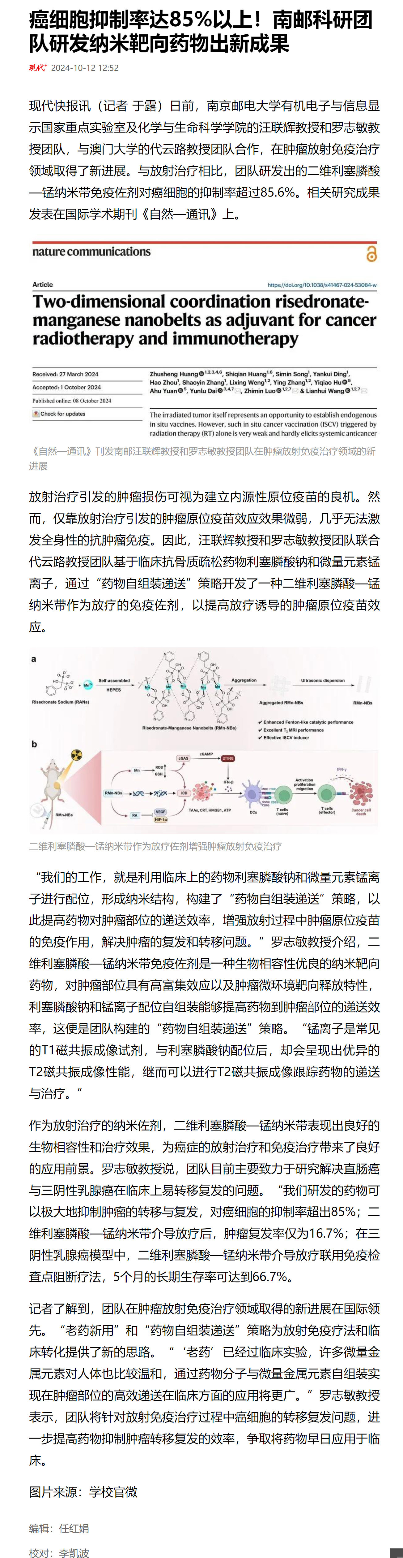 | 【現(xiàn)代快報(bào)全媒體】癌細(xì)胞抑制率達(dá)85%以上!南郵科研團(tuán)隊(duì)研發(fā)納米靶向藥物出新成果 |