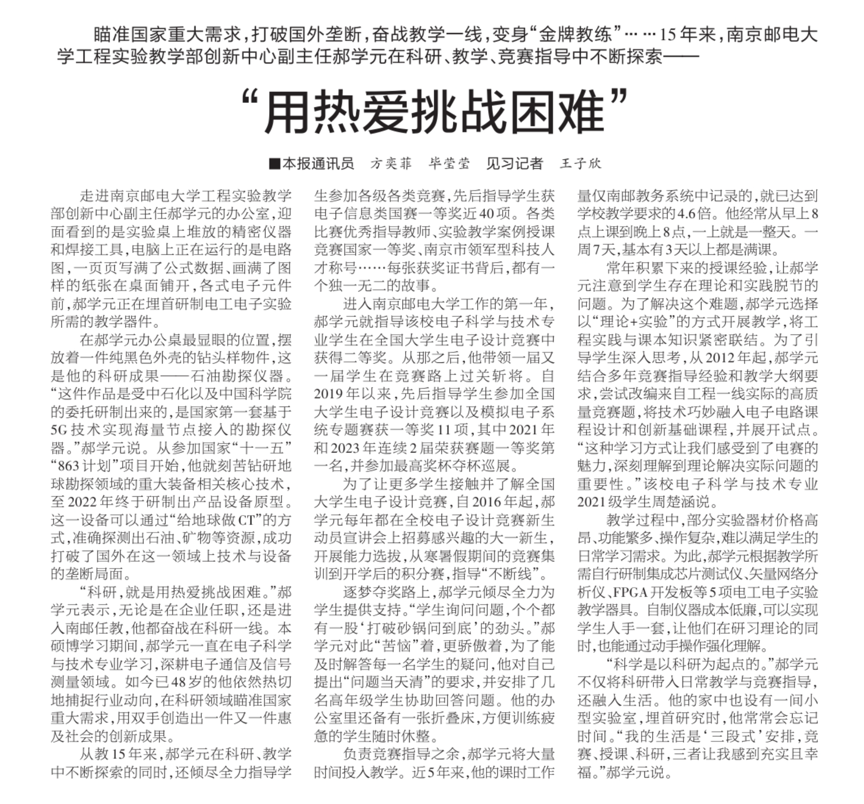 | 【江蘇教育報】南京郵電大學工程實驗教學部創新中心副主任郝學元在科研、教學、競賽指導中不斷探索——“用熱愛挑戰困難” |
