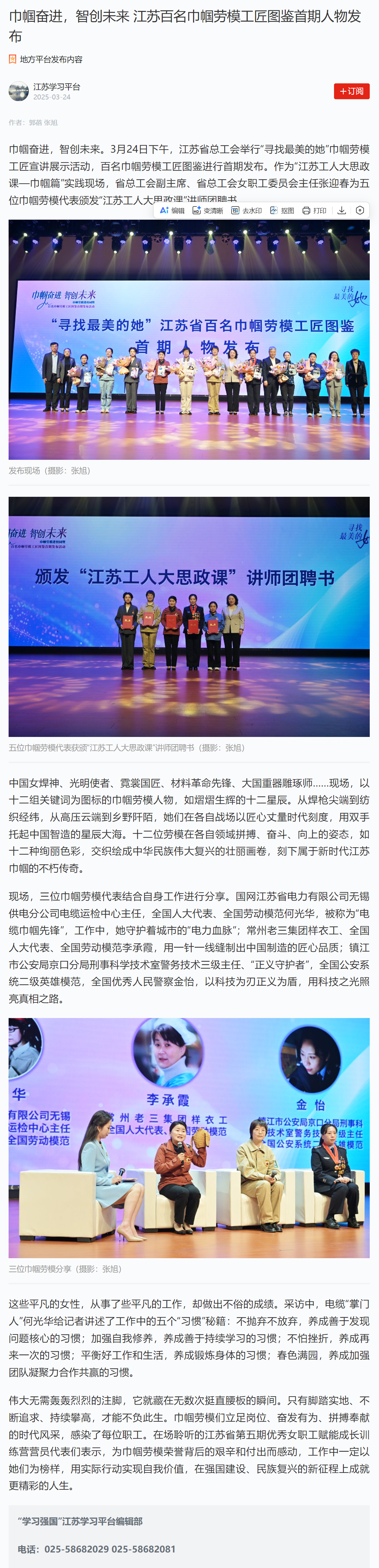 | 【學習強國】巾幗奮進,智創未來?江蘇百名巾幗勞模工匠圖鑒首期人物發布 |