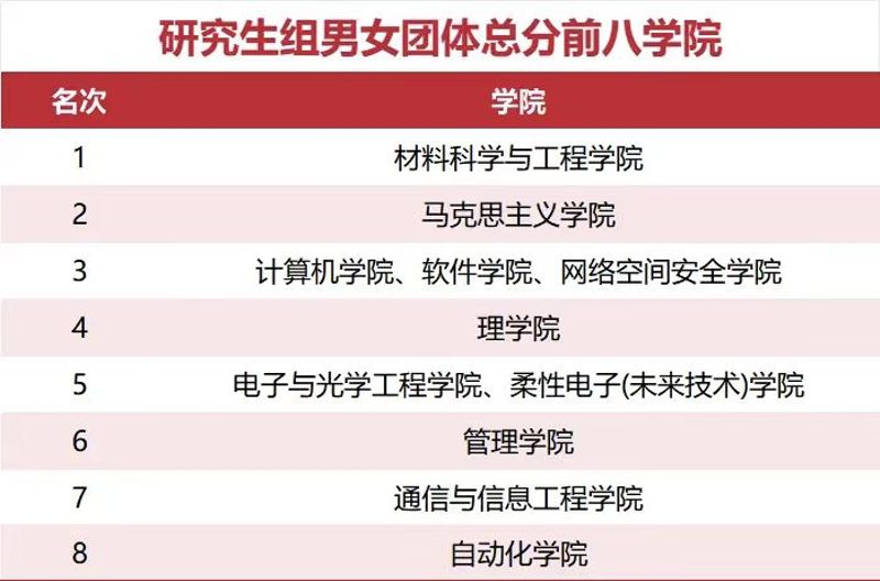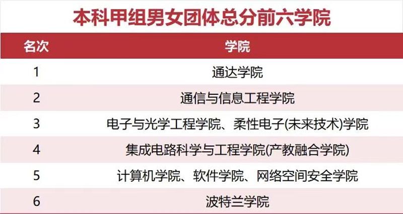 10月25日下午,運(yùn)動(dòng)會(huì)落幕。材料科學(xué)與工程學(xué)院榮獲研究生男女團(tuán)體總分第一名,海外教育學(xué)院榮獲本科女子乙組團(tuán)體、本科男子乙組團(tuán)體、本科乙組男女團(tuán)體總分第一名,通達(dá)學(xué)院榮獲本科女子甲組團(tuán)體、本科男子甲組團(tuán)體總分第一名。數(shù)字媒體與設(shè)計(jì)藝術(shù)學(xué)院,電子與光學(xué)工程學(xué)院、柔性電子(未來(lái)技術(shù))學(xué)院,自動(dòng)化學(xué)院,貝爾英才學(xué)院,物聯(lián)網(wǎng)學(xué)院,計(jì)算機(jī)學(xué)院、軟件學(xué)院、網(wǎng)絡(luò)空間安全學(xué)院獲評(píng)“最美方陣”。