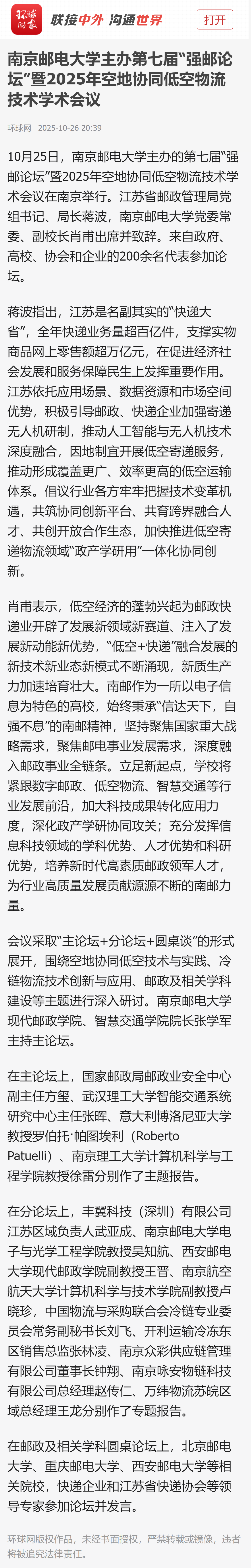 | 【環(huán)球網(wǎng)】南京郵電大學(xué)主辦第七屆“強郵論壇”暨2025年空地協(xié)同低空物流技術(shù)學(xué)術(shù)會議 |