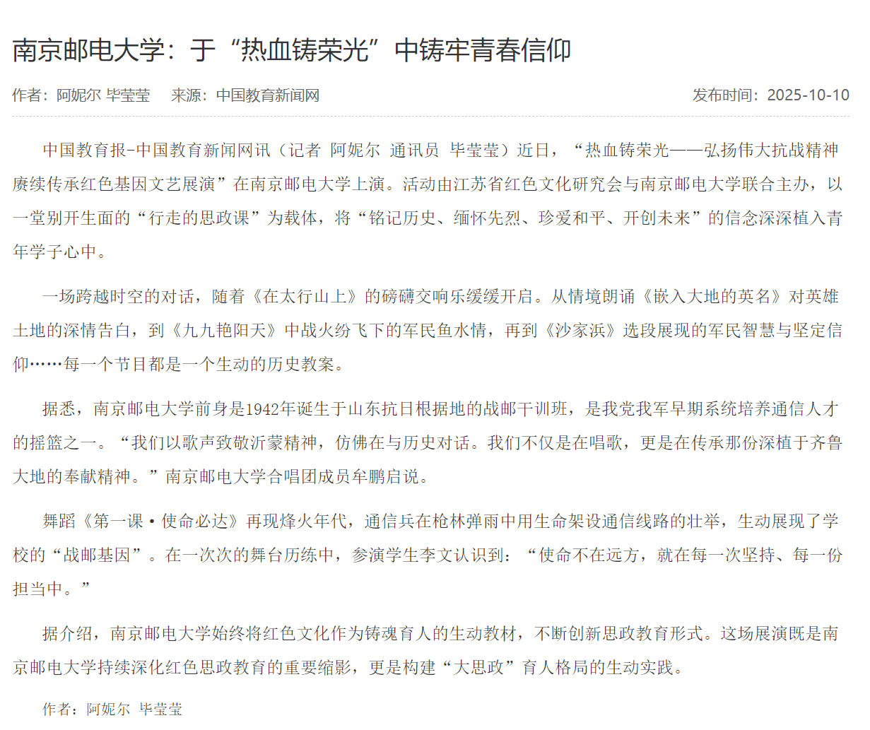 【中國教育新聞網】南京郵電大學:于“熱血鑄榮光”中鑄牢青春信仰