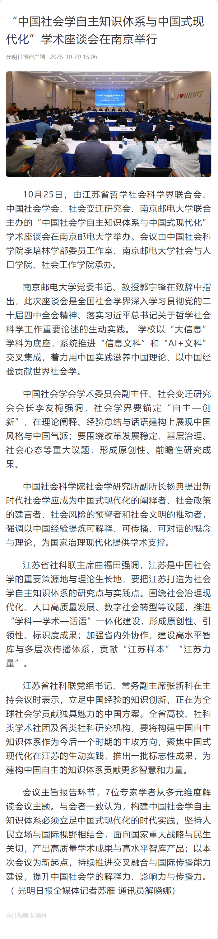 【光明日報客戶端】“中國社會學自主知識體系與中國式現代化”學術座談會在南京舉行
