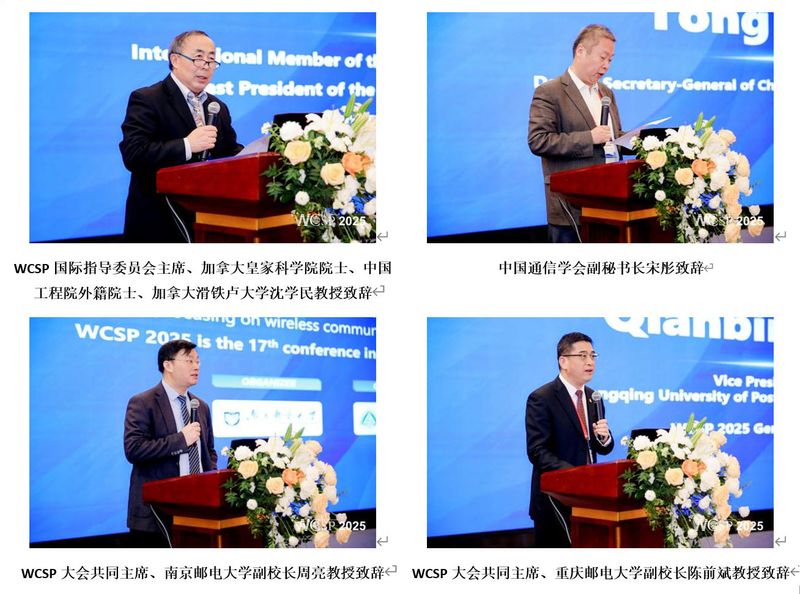 WCSP國際指導委員會主席、加拿大皇家科學院院士、中國工程院外籍院士、加拿大滑鐵盧大學沈學民教授,中國通信學會副秘書長宋彤,WCSP大會共同主席、南京郵電大學副校長周亮教授、重慶郵電大學副校長陳前斌教授致辭。