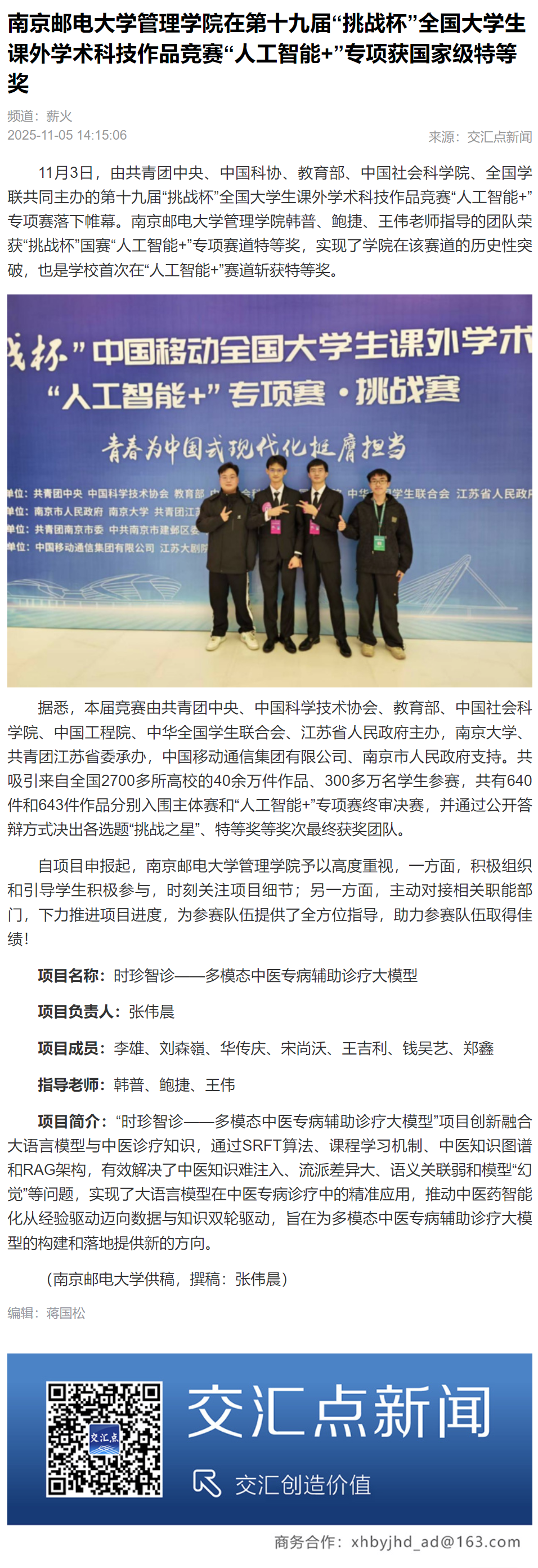 | 【新華日報客戶端】南京郵電大學管理學院在第十九屆“挑戰杯”全國大學生課外學術科技作品競賽“人工智能+”專項獲國家級特等獎 |