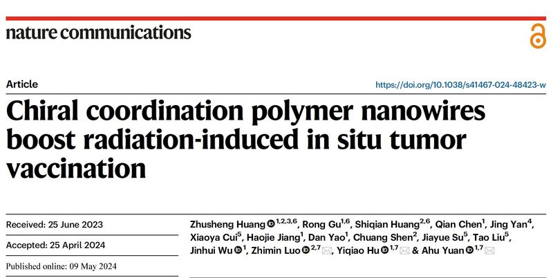 Recently, Professor Zhimin Luo from the State Key Laboratory of Organic Electronics and Information Displays (SKLOEID) and the School of Chemistry and Life Sciences at Nanjing University of Posts and Telecommunications (NJUPT), in collaboration with the Nanjing University, has achieved a research progress in chiral nano-adjuvants and in situ tumor vaccines. The relevant findings were published under the title Chiral coordination polymer nanowires boost radiation-induced in situ tumor vaccination in the international academic journal Nature Communications.