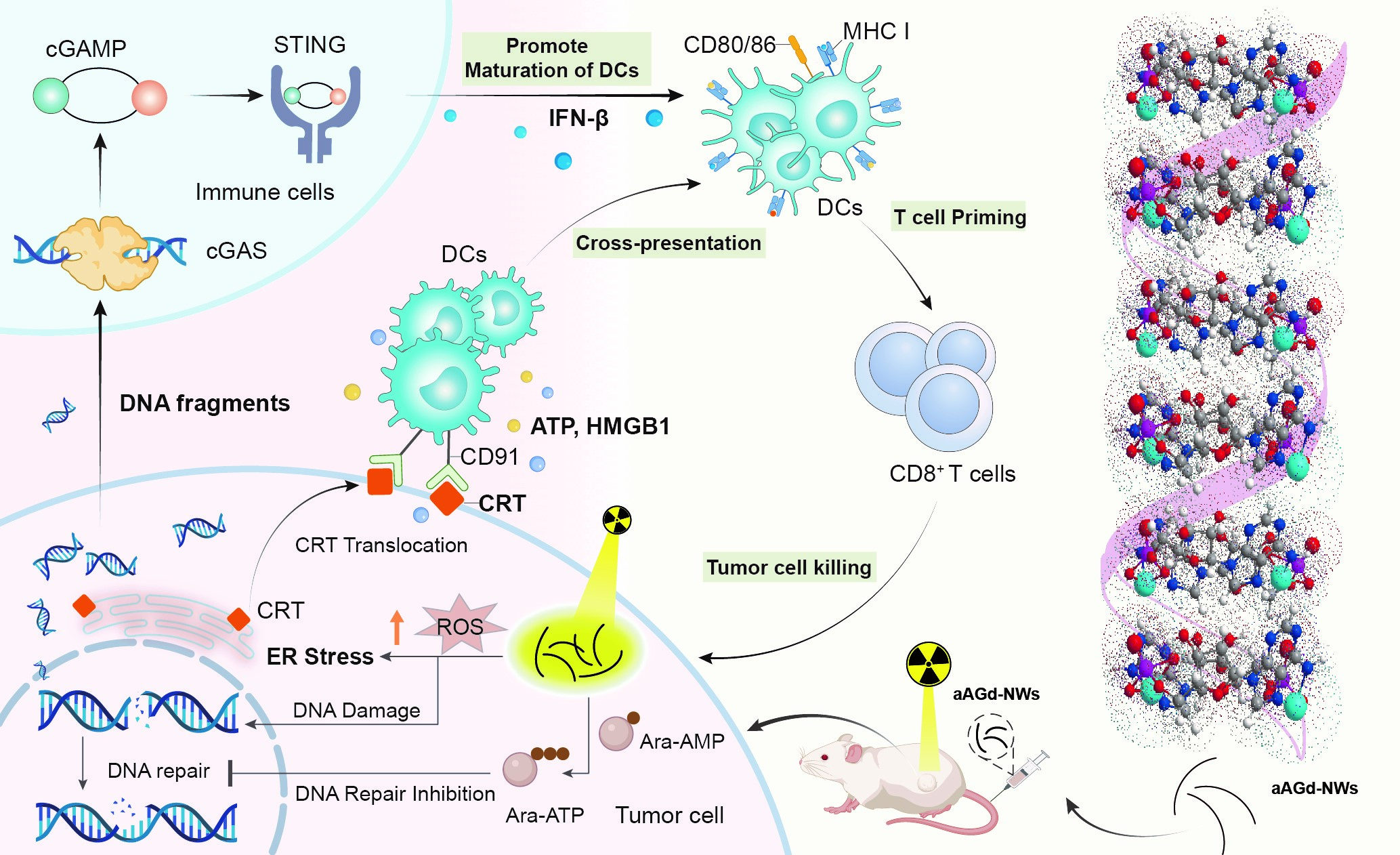 Radiation therapy for tumors is akin to administering an endogenous in-situ vaccine. However, the effect of this radiation-induced endogenous in-situ vaccine is extremely weak, barely able to induce a systemic anti-tumor immune response. Based on clinical antiviral drugs (Vidarabine Monophosphate) and MRI contrast agents (gadolinium ions) through coordination self-assembly and phase control techniques, the team developed chiral Vidarabine Monophosphate (ara-AMP) Gadolinium nanowires (aAGd-NWs) to enhance the tumor in-situ vaccine effect induced by radiotherapy. With the assistance of Dr. Xiaoya Cui , Dr. Jiayue Su, and Professor Tao Liu from the Tsinghua University, the team used cryo-transmission electron microscopy to resolve the structural characteristics of aAGd-NWs, including ultrafine morphology, surface coordination, and right-handed helical chirality, elucidating the mechanism of chiral self-assembly of aAGd-NWs. Biologically, aAGd-NWs not only enhance X-ray deposition and scattering, increasing the sensitivity of radiotherapy, but also effectively inhibit tumor cell DNA self-repair, activate the cGAS-STING pathway to promote the secretion of type I interferon, and increase the infiltration of CD8+ T cells in tumor tissues. And synergistic immune checkpoint blockade therapy could significantly further enhance the in-situ vaccine effect induced by radiotherapy.