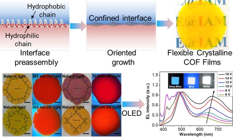 Based on this breakthrough, the team constructed the first COF-based flexible organic light-emitting diode (OLED) prototype. The device achieved record-high photoelectric conversion efficiency for its class, with emission color tunable from deep blue to white through voltage modulation—offering a new approach for smart dynamic displays. The study also tracked the COF film's interface preassembly, directional growth, and crystallization processes using time-resolved SEM, XRD, and FTIR, providing experimental evidence for understanding material growth dynamics.
