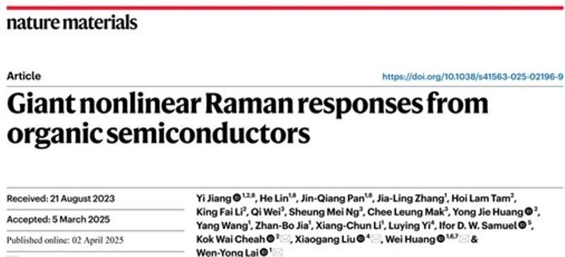 Recently, a research team led by Academician Huang Wei and Professor Lai Wenyong from the National Key Laboratory of Flexible Electronics/School of Chemistry and Life Sciences at Nanjing University of Posts and Telecommunications (NJUPT), in collaboration with international institutions such as Hong Kong Baptist University and the National University of Singapore, has achieved a milestone in the field of nonlinear optics in organic semiconductors. The team innovatively proposed a theoretical model of “spectral-tunable gain-induced Raman lasing”, revealing the core mechanism of resonance matching between molecular vibrations and stimulated emission. For the first time, they successfully achieved exponential amplification of Raman signals and efficient multi-order Raman lasing in organic semiconductor materials—without relying on complex optical microcavity structures. This research breaks through the bottleneck of traditional nonlinear optical theory, which assumes “weak molecular vibrational gain and dependence on high-energy pumping”, laying a theoretical foundation for expanding the application of organic semiconductors in nonlinear optics, particularly in Raman lasers. It also provides new ideas and methods for developing flexible Raman lasers and enabling high-precision sensing and detection. The study, titled Giant nonlinear Raman responses from organic semiconductors, has been published in the prestigious journal Nature Materials (2025, DOI: 10.1038/s41563-025-02196-9).